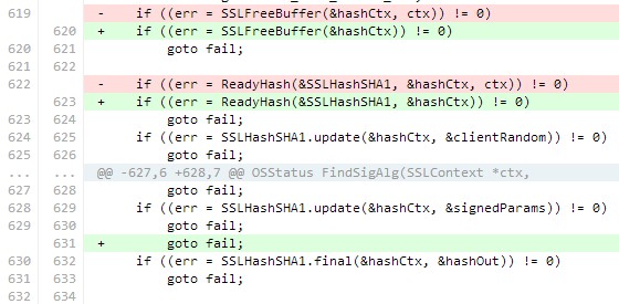 Adam Langley的《Apple’s SSL/TLS bug 》的博文暴出了这个bug的细节。(在苹果的开源网站上,通过查看苹果的和SSL/TLS有关的代码变更,我们可以在文件sslKeyExchange.c中找到下面的代码)