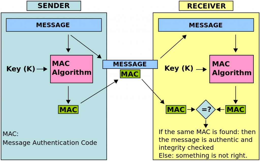 先说HMAC技术,这个东西来自于MAC – Message Authentication Code,是一种用于给消息签名的技术,也就是说,我们怕消息在传递的过程中被人修改,所以,我们需要用对消息进行一个MAC算法,得到一个摘要字串,然后,接收方得到消息后,进行同样的计算,然后比较这个MAC字符串,如果一致,则表明没有被修改过(整个过程参看下图)。而HMAC – Hash-based Authenticsation Code,指的是利用Hash技术完成这一工作,比如:SHA-256算法。