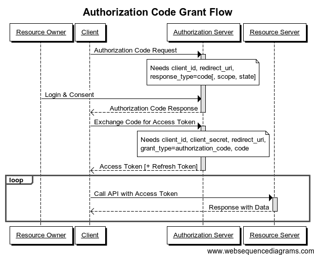 Authorization Code 是最常使用的OAuth 2.0的授权许可类型,它适用于用户给第三方应用授权访问自己信息的场景。这个Flow也是OAuth 2.0四个Flow中我个人觉得最完整的一个Flow,其流程图如下所示。