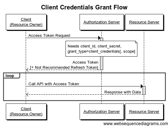 Client Credential 是一个简化版的API认证,主要是用于认证服务器到服务器的调用,也就是没有用户参与的的认证流程。下面是相关的流程图。