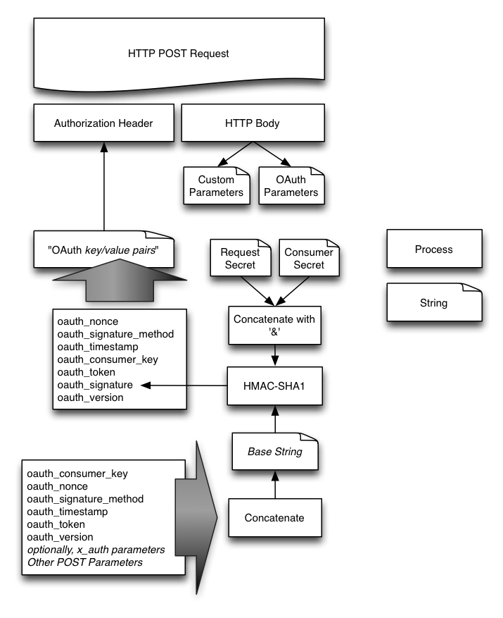 &作连接符。假设 Consumer Secret 为j49sk3j29djd而 Token Secret 为dh893hdasih9那个,签名密钥为:j49sk3j29djd&dh893hdasih9 - 在请求Request/Access Token的时候需要对整个HTTP请求进行签名(使用HMAC-SHA1和HMAC-RSA1签名算法),请求头中需要包括一些OAuth需要的字段,如: