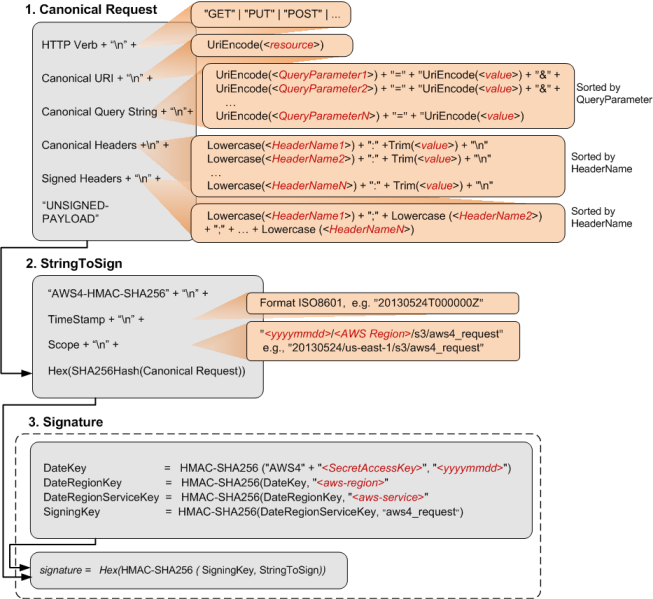 AWS4-HMAC-SHA256、时间戳、Scop,再打一个包,叫StringToSign。 - 准备签名,用