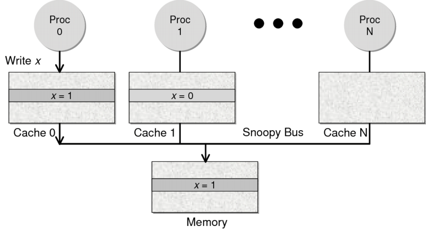 下面是个示例(如果你想看一下动画演示的话,这里有一个网页(MESI Interactive Animations),你可以进行交互操作,这个动画演示中使用的Write Through算法):