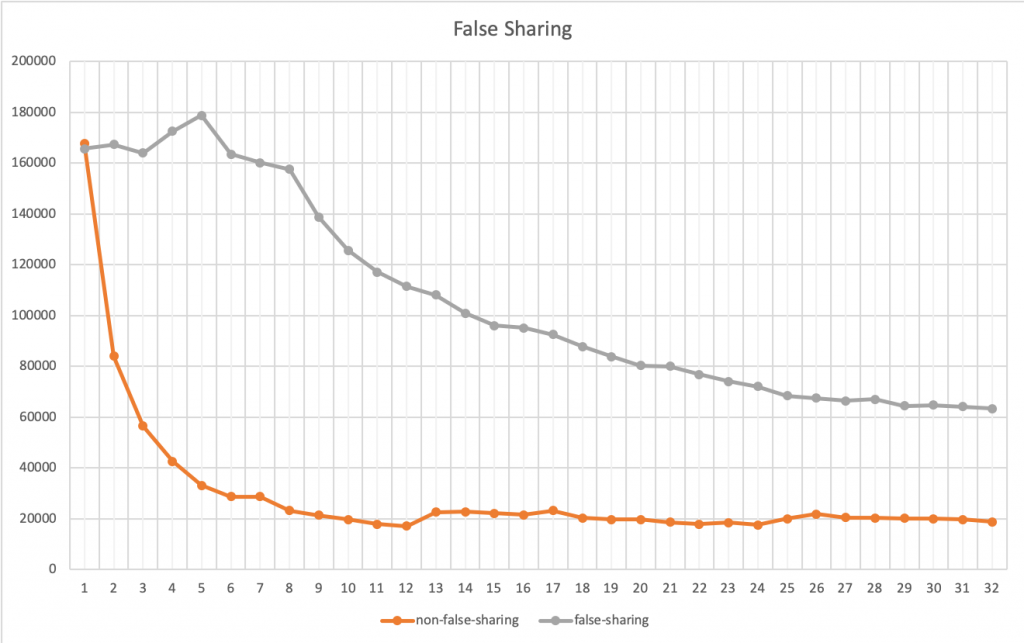 上图中,我们可以看到,灰色的曲线就是第一种方法,橙色的就是第二种(用局部变量的)方法。当只有一个线程的时候,两个方法相当,基本没有什么差别,但是在线程数增加的时候的时候,你会发现,第二种方法的性能提高的非常快。直到到达6个线程的时候,开始变得稳定(前面说过,我的CPU是6核的)。而第一种方法无论加多少线程也没有办法超过第二种方法。因为第一种方法不是CPU Cache 友好的。也就是说,第二种方法,只要我的CPU核数足够多,就可以做到线性的性能扩展,让每一个CPU核都跑起来,而第一种则不能。