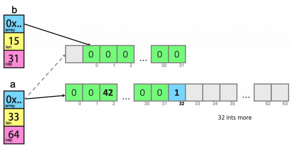 a := make([]int, 32) b := a[1:16] a = append(a, 1) a[2] = 42
