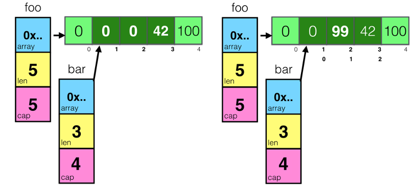 foo = make([]int, 5) foo[3] = 42 foo[4] = 100 bar := foo[1:4] bar[1] = 99