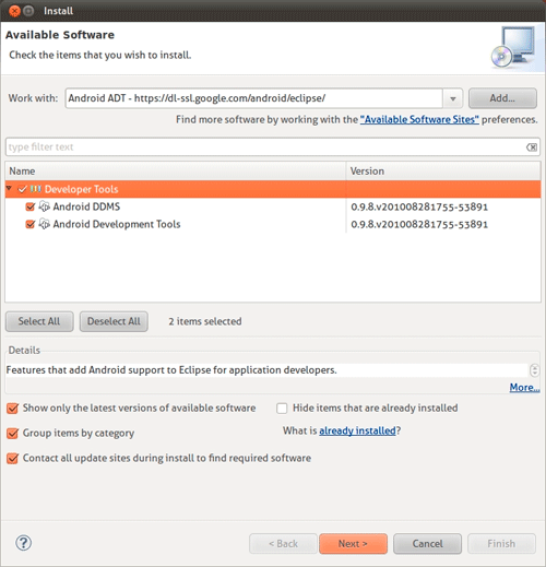 - 检查可用软件中有Developer Tools并点击OK按钮。这将安装Android Development Tools 和DDMS, Android的调试工具。