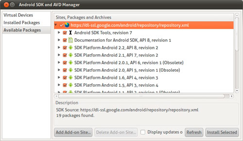 - 点击左栏中的Available Packages 并选择选择Respository中有效的Android SDK平台。
