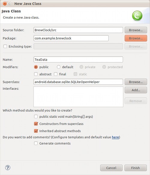 通过菜单File → New → Class.在BrewClock项目中创建一个TeaData的新类。确保TeaData扩展于android.database.sqlite.SQLiteOpenHelper 类,并选中“Constructors from superclass”复选框。