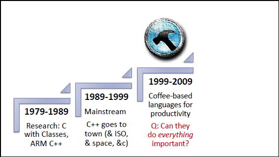 - 1999 – 2009:Coffee-based语言(Java, .NET)出现了,极大的提高了开发生产力。