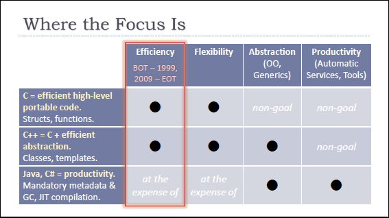 5)Herb给了一张表格,这张表可相当形像。如果把我们的对编程语言的需求总结为四个:效率,灵活,抽象,生产率。那么,C语言玩的是前两个,而C++玩的是前三个,Java和C#玩的是后两个(抽象和生产率)
