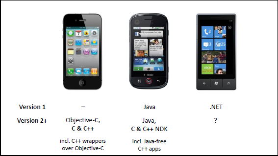 c)这三个手机在第一版出来时都不支持C++,而第二版出来时都支持C++了。因为他们要兼顾性能和一定程度上的开发效率。WinPhone还没有到第二版,让我们拭目以待。(我以前写过一篇调侃Android支持C++开发的文章,这也只是一年前的事,说明C++全面回归了)