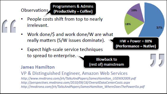 88%的钱花在了硬件和电力上。这可是很大一笔费用啊。(还有人说硬件比软件便宜吗?)我记得我上一个公司的数据中心每年要花的电费就在百万美元以上。