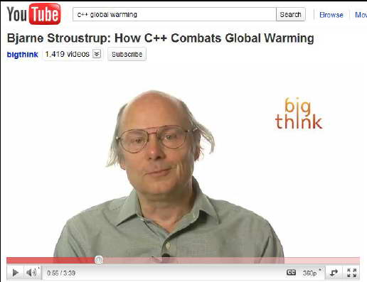 My contribution to the fight against global warming is C++’s efficiency: Just think if Google had to have twice as many server farms! Each uses as much energy as a small town. And it’s not just a factor of two… Efficiency is not just running fast or running bigger programs, it’s also running using less resources.