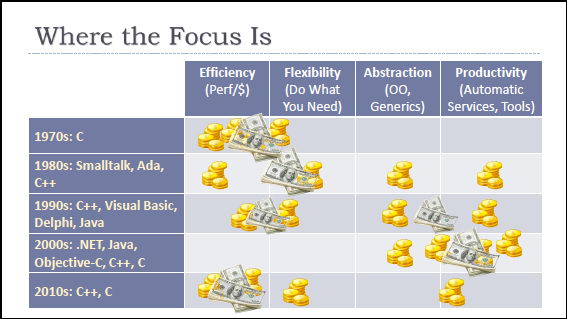 Herb认为,2009-2019是第四个时期,因为我们又喜欢Native Code了,C++从被驱逐后又被请回来了。因为网站的性能越来越是个问题,移动端的设备非常流行。但主要是因为Performance就是钱,因为前面的三个因素,性能影响的是dollar,不尊重性能的公司都会发现花钱的速度太快了。(比如去年大家热炒的京东促销和12306.cn的问题,12306给整个社会造成了巨大的金钱浪费)