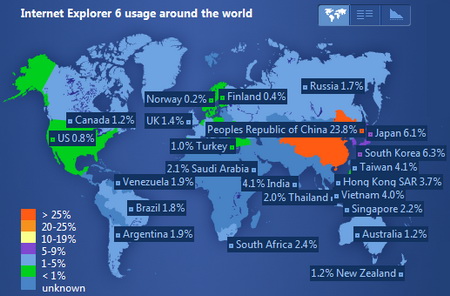 - 拒绝IE6。如果你坚决不用IE6,并影响你身边的人,让他们升级IE6,尝试Chrome 或 Firefox,多告诉一下自己身边的朋友,怎么设计口令,怎么在互联网上保护自己的隐私和安全,怎么防木马,这样就能少一些问题,少装两次系统,就能省一些电,也就能多一些时间去做一些更有意义的事。也是在为整个世界整个人类做贡献。(看看某些软件产商,占据着用户桌面的江山,还整天弹窗弹窗的,说这不安全,那不安全的。你还是做安全的,你居然能容忍IE6装在用户的机器上,你还做个屁的安全!)2011年3月份,我国的IE6用户的百分比是34%, 那时中国网民4.5亿,平均每三个人中有一个,2012年3月份,中国的比例还有24%左右,不过中国的网民数达到了5.13亿,也就是说,平均5个人里有一个,但是中国依然是全世界的IE6占有量最大的,参看下图(来自:http://www.ie6countdown.com)面对下面的图片,你作何感想呢?