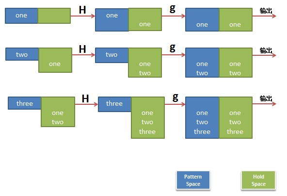 h: 将pattern space中的内容拷贝到hold space中,原来的hold space里的内容被清除